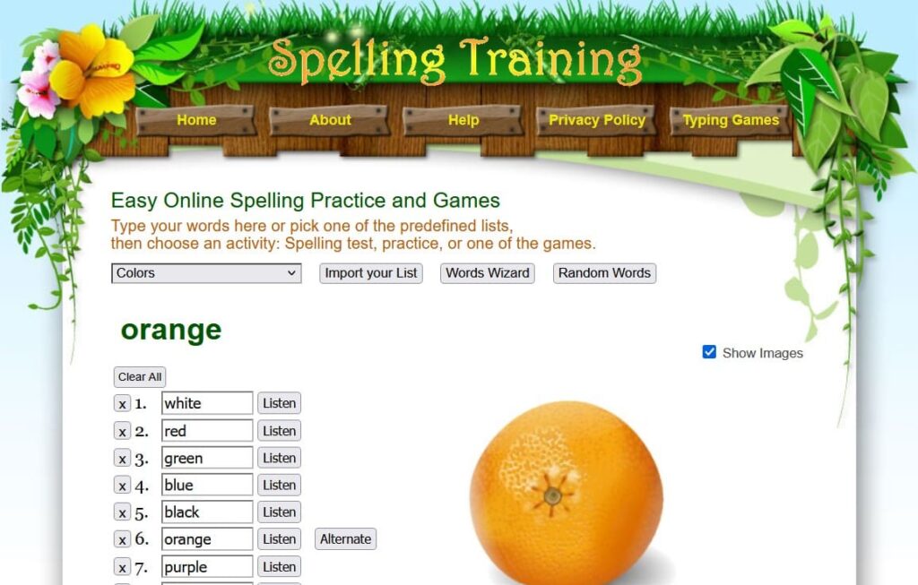 Điểm nổi bật đầu tiên của SpellingTraining là khả năng tạo danh sách từ vựng riêng. Người dùng có thể nhập các từ muốn học hoặc chọn danh sách từ có sẵn theo chủ đề như màu sắc, động vật, số đếm, hay theo cấp lớp. Các danh sách này được lưu trực tiếp trên trình duyệt, giúp người học dễ dàng quay lại ôn tập mà không cần tài khoản đăng nhập.
