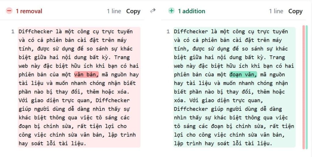 Diffchecker là một công cụ trực tuyến và có cả phiên bản cài đặt trên máy tính, được sử dụng để so sánh sự khác biệt giữa hai nội dung bất kỳ. Trang web này đặc biệt hữu ích khi bạn có hai phiên bản của một văn bản, mã nguồn hay tài liệu và muốn nhanh chóng nhận biết phần nào bị thay đổi, thêm hoặc xóa. Với giao diện trực quan, Diffchecker giúp người dùng dễ dàng nhìn thấy sự khác biệt thông qua việc tô sáng các đoạn bị chỉnh sửa, rất tiện lợi cho công việc chỉnh sửa văn bản, lập trình hay soát lỗi tài liệu.