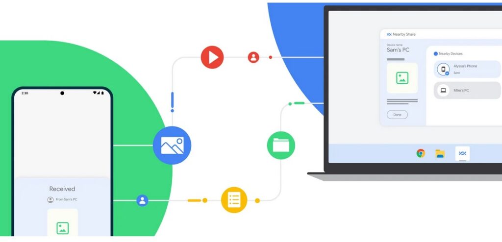 Nearby Sharing (Chia sẻ lân cận) là tính năng do Google phát triển, giúp người dùng chia sẻ nhanh các tệp, ảnh, video, đường link hoặc tài liệu giữa các thiết bị Android, Chromebook và máy tính Windowskhông cần kết nối Internet.