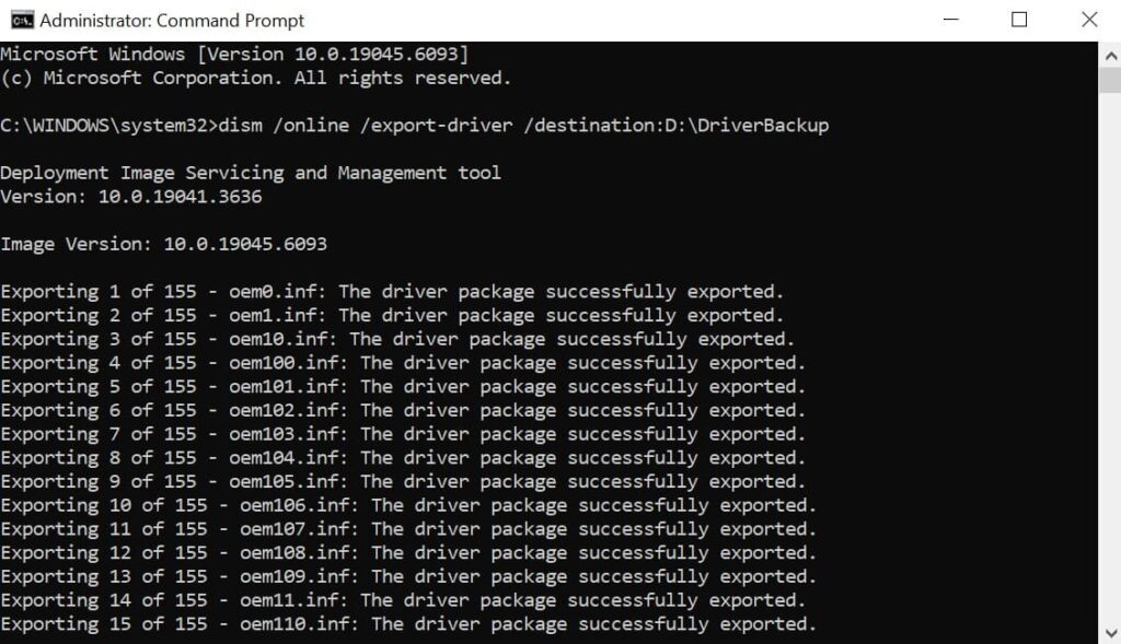 Trong đó, D:\DriverBackup là nơi lưu driver sao lưu. Bạn có thể thay đổi sang thư mục khác như E:\Driver hoặc USB nếu muốn. Sau khi nhấn Enter, hệ thống sẽ tự động quét và sao lưu toàn bộ driver trên máy vào thư mục đã chọn. Thời gian thực hiện nhanh hay chậm phụ thuộc vào số lượng driver trên máy.