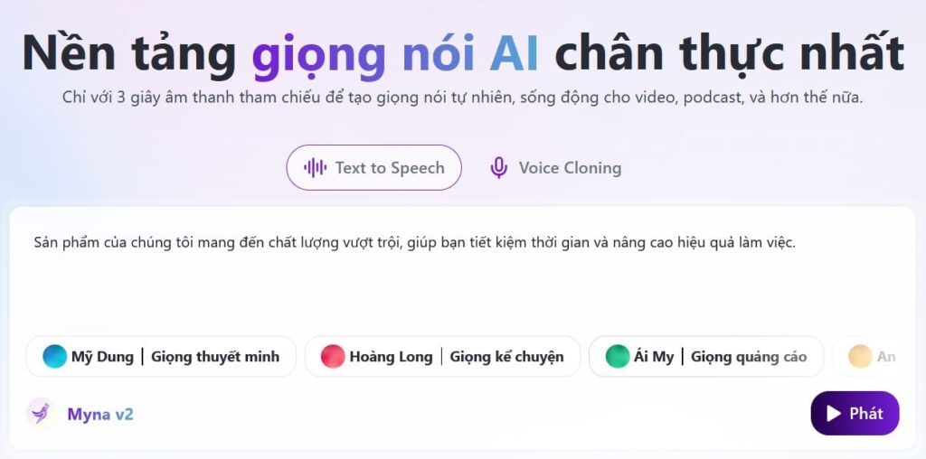 Ngoài ra, nền tảng này còn cung cấp tính năng nhân bản giọng nói (Voice Cloning). Chỉ cần một đoạn ghi âm ngắn, hệ thống có thể tái tạo giọng nói tương tự bản gốc với đặc điểm âm sắc và nhịp điệu riêng biệt. Tính năng này đặc biệt hữu ích cho những người muốn giữ thương hiệu cá nhân trong nội dung số mà không phải thu âm nhiều lần.
