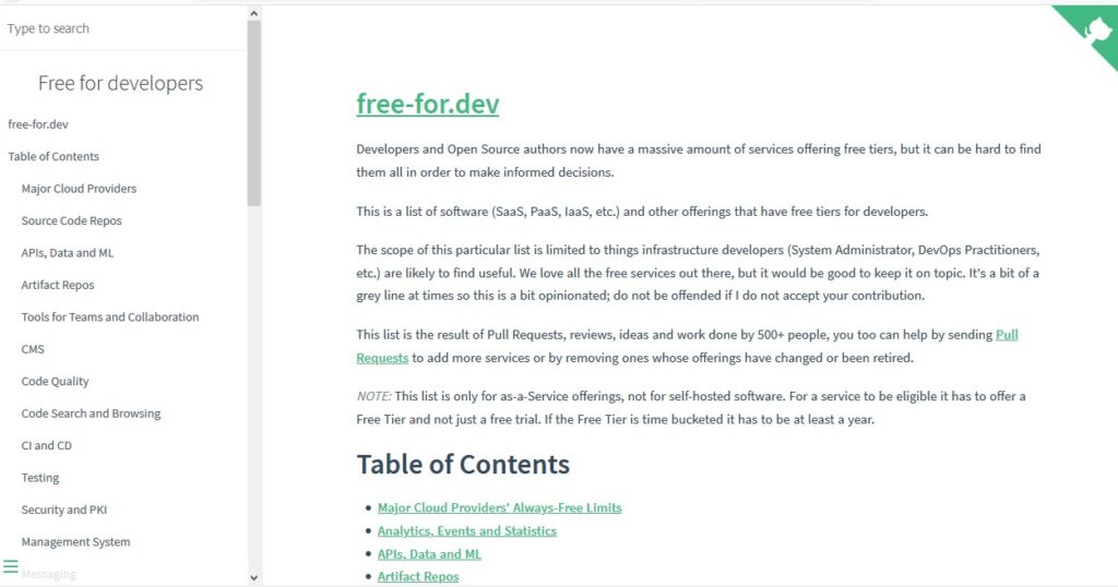 Free For Dev là một danh sách tổng hợp các dịch vụ trực tuyến cung cấp gói miễn phí (Free Tier) dành cho lập trình viên, kỹ sư DevOps, quản trị hệ thống và những người làm việc trong lĩnh vực công nghệ thông tin. Nền tảng này được xây dựng dưới dạng một dự án mã nguồn mở do cộng đồng phát triển và cập nhật liên tục trên GitHub. Mục tiêu của Free For Dev là giúp người dùng dễ dàng tìm thấy các công cụ, nền tảng và dịch vụ công nghệ có thể sử dụng miễn phí trong quá trình học tập, nghiên cứu hoặc phát triển dự án phần mềm.