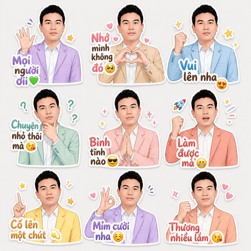Xu hướng tạo sticker cá nhân từ ảnh thật bằng AI đang rất phổ biến trên Facebook, Messenger, Zalo và Telegram. Chỉ cần một tấm ảnh chân dung và một prompt chuẩn, bạn có thể biến chính mình thành bộ sticker cảm xúc cực kỳ dễ thương, đồng bộ khuôn mặt và mang phong cách riêng.